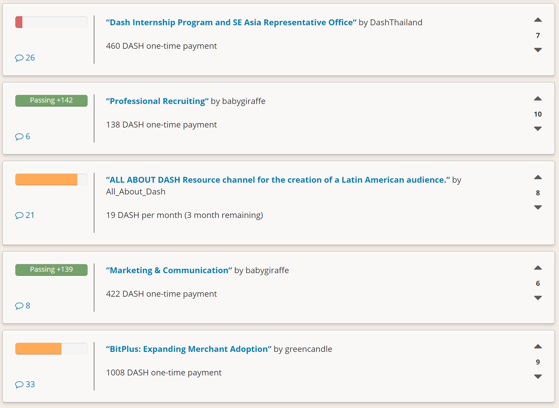 A typical view of proposal discussion and voting on Dash Central#