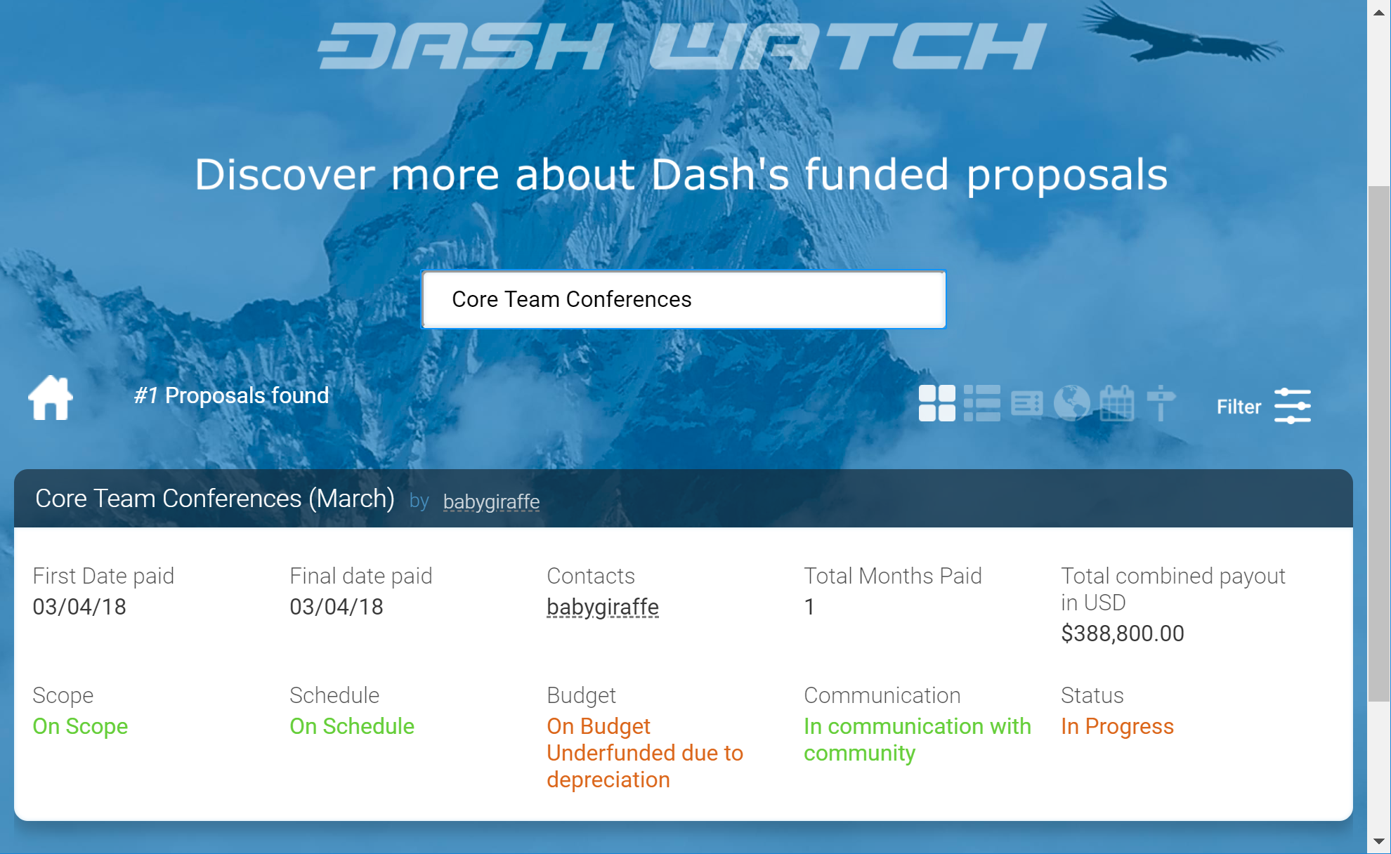Finally, Dash Watch (which was itself funded through a budget proposal) exists to monitor the ability of blockchain contractors to deliver on their promises with respect to delivery dates and the total amounts of budget allocated over multiple voting periods. A team of dedicated staff routinely interact with proposal owners to track progress of the various projects and provide reports to voting masternodes in a single location. While providing data on the performance of your proposal to Dash Watch is optional, many masternode owners take advantage of the data they make available to make their voting decisions. The Dash Watch team may be contacted at team@dashwatch.org email address or through their website.