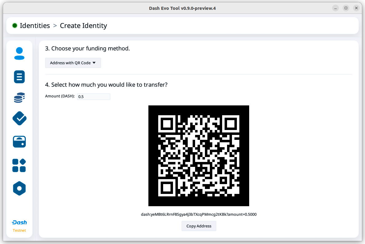 Then, choose your funding method and send the requested amount of DASH to the provided address.