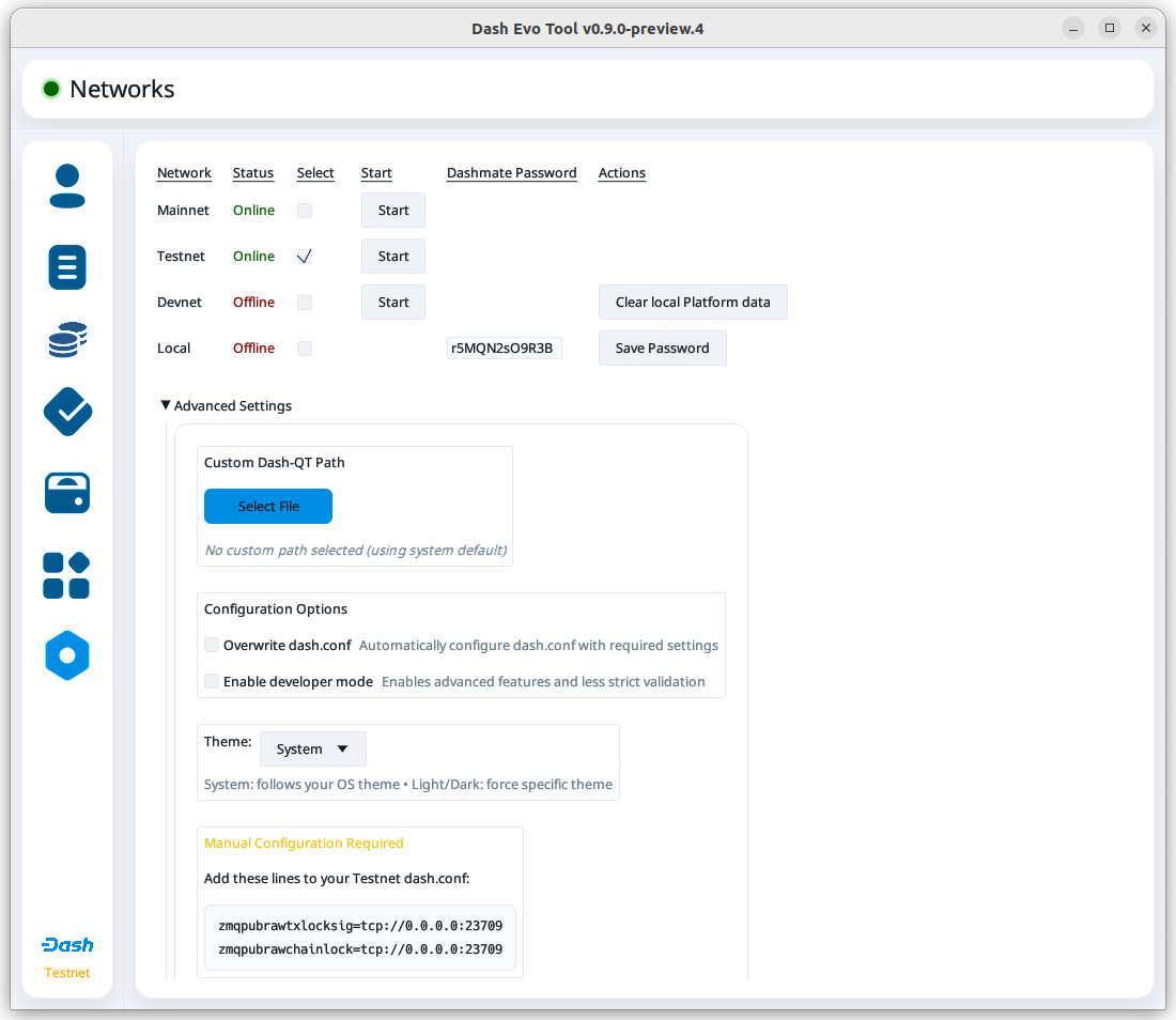 The Dash Evo Tool includes a configuration file that will work without modification. If you have a custom Dash Core config file that you want to continue using, expand the dropdown below for advanced configuration details.