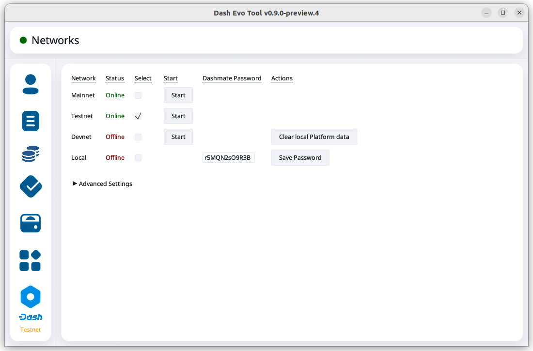 The Dash Evo Tool supports both testnet and mainnet. To choose a network, navigate to the Network Selection screen and click the checkbox in the Select column for the desired network. Then click the Start button on that row to launch Dash Core.