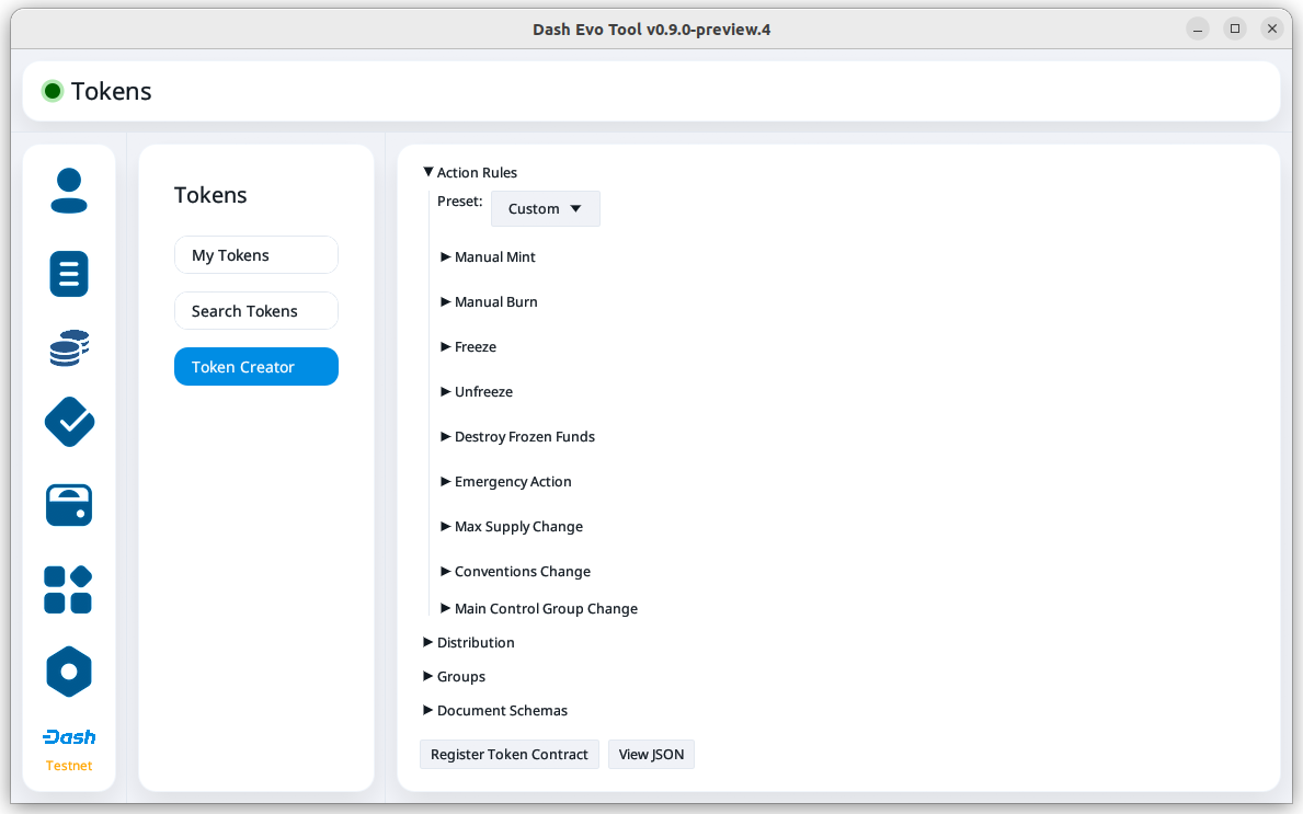 The Dash Evo Tool provides several pre-defined action templates to simplify token configuration: