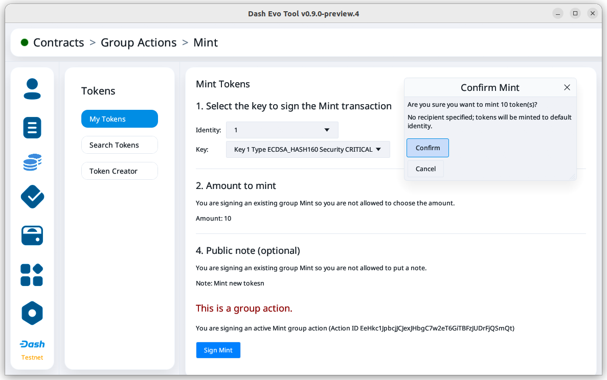 The Group Actions screen allows querying group action requests. Select a contract and an identity, then click Fetch Group Actions to see all related group actions request.