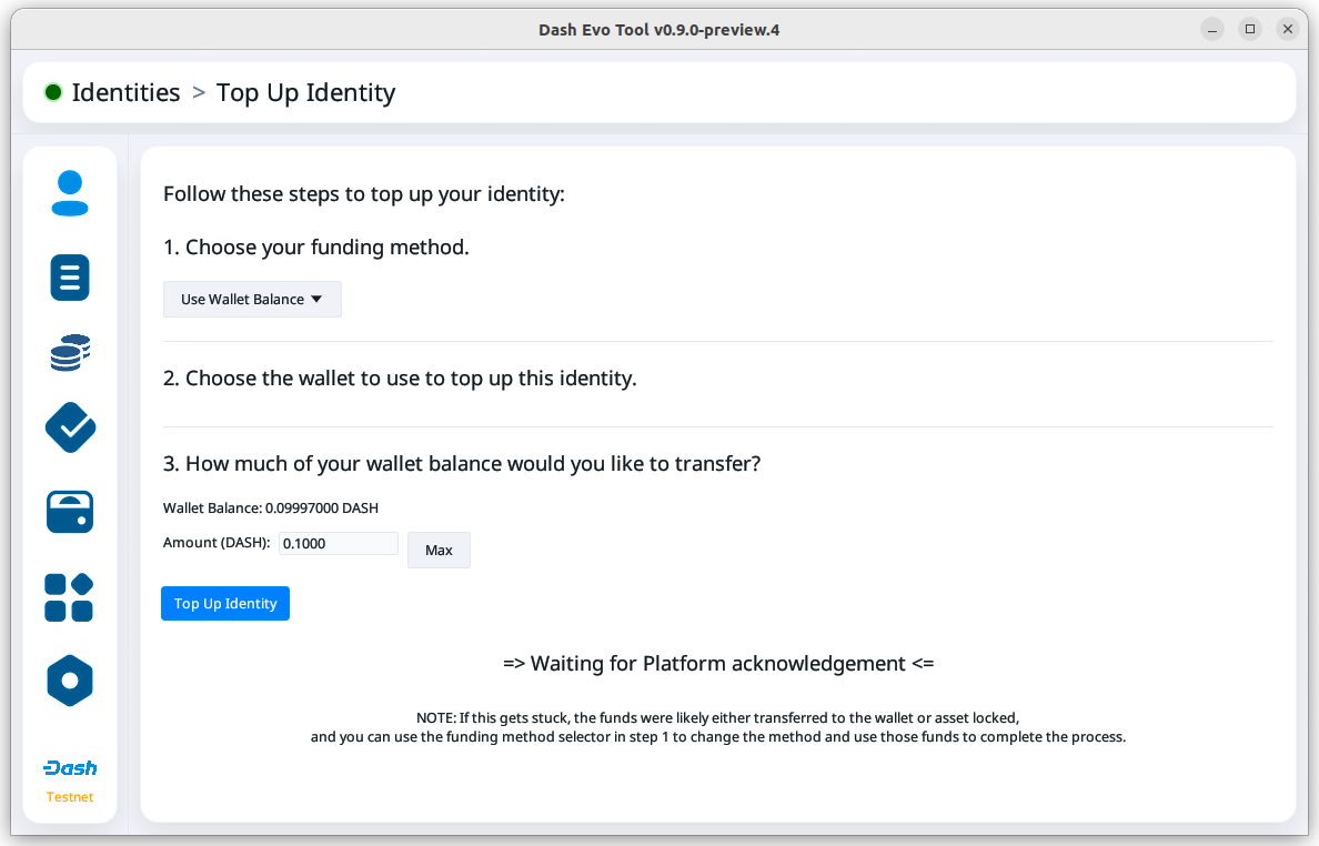 Before topping up an identity, make sure you have added a Dash Evo Tool wallet.