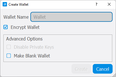 You will be prompted to create a new wallet with a custom wallet name. By default, your wallet will be encrypted. You may choose to uncheck the box and encrypt the wallet later. We have included instructions on how to encrypt your wallet in the following section.