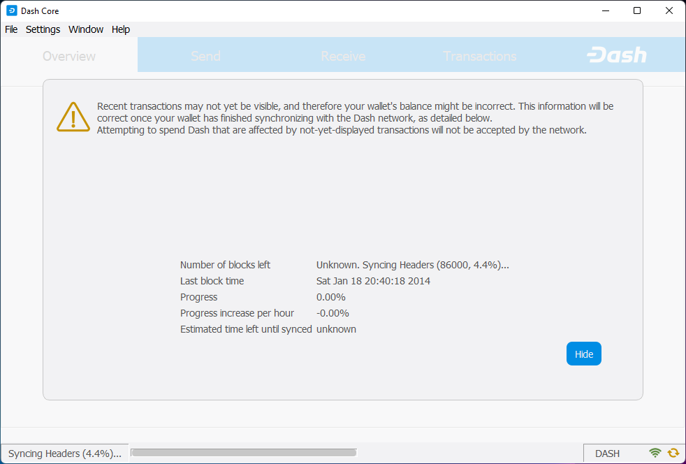 Dash Core begins synchronizing with the Dash network#