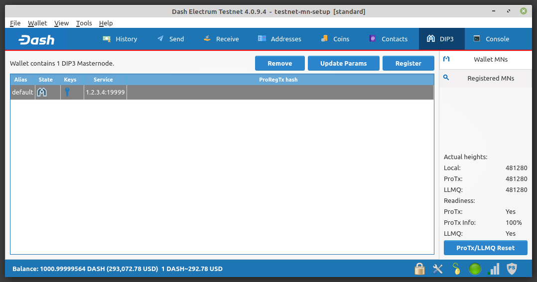 DIP3 tab showing registered masternode#
