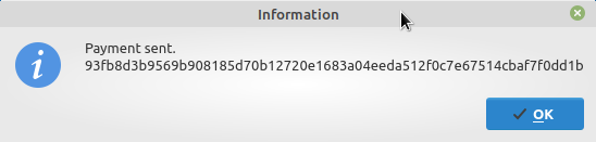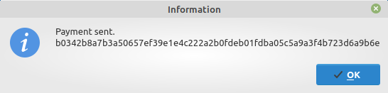 The transaction hash will be displayed once the transaction has been sent successfully. Click OK to close the screen.